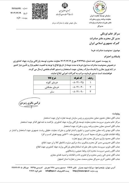 در نامه دفتر مقررات صادرات و واردات سازمان توسعه تجارت آمده است «به پیوست تصویر نامه شماره ٤١٣٣٩٥ مورخ ١٤٠٣ / ١٢ / ١٢ معاونت محترم توسعه بازرگانی وزارت جهاد کشاورزی در خصوص ممنوعیت صادرات سه نوع خرما به مدت دو ماه از تاریخ ابلاغ با توجه به اهمیت تنظیم بازار و تأمین نیاز کشور در ایام نوروز مقارن با ایام ماه مبارک رمضان، جهت استحضار و دستور اقدام مقتضی ارسال میگردد. خواهشمند است دستور فرمائید مراتب را به گمرکات اجرایی ابلاغ نمایند.»